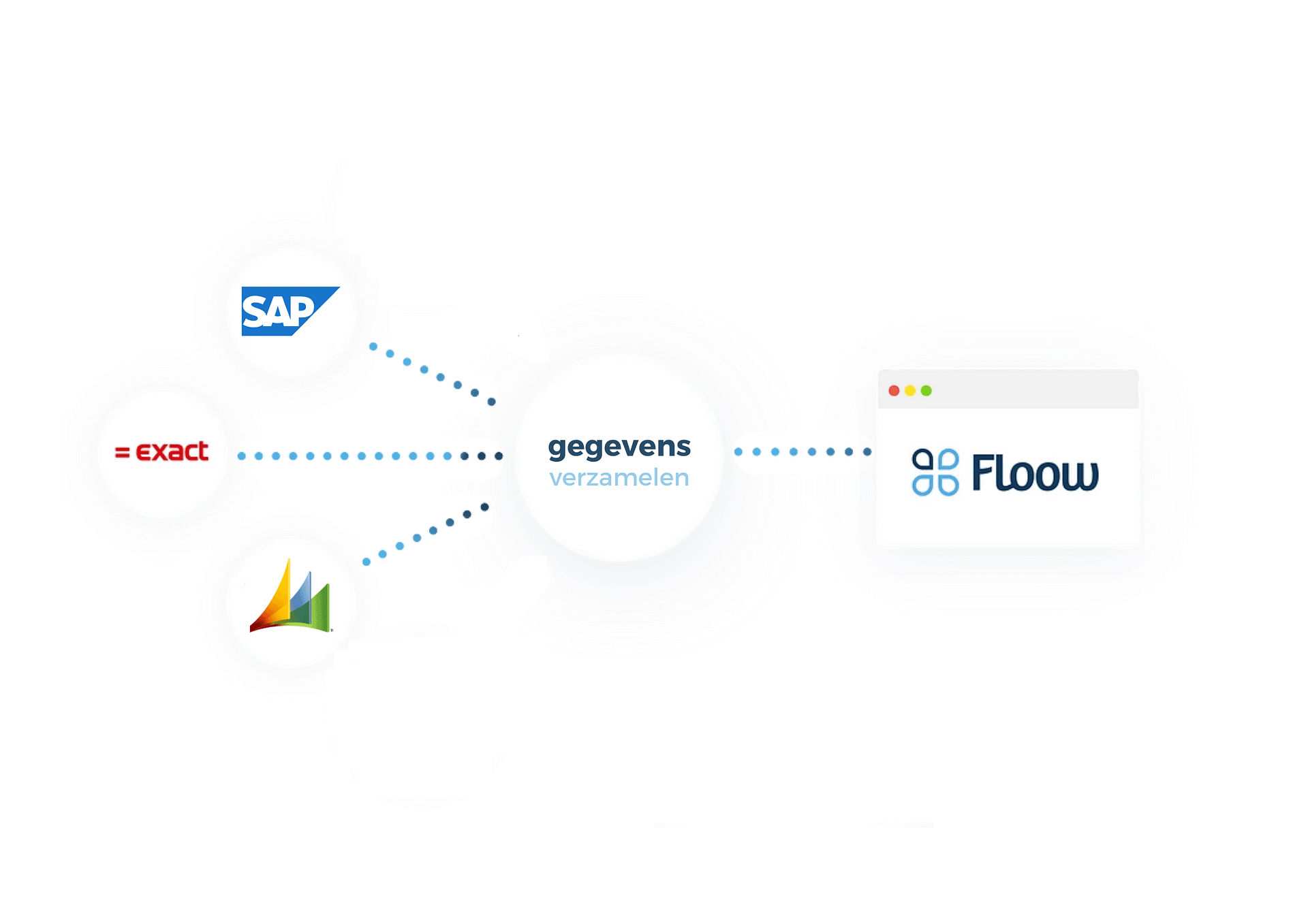 Helaas komen gegevens niet altijd uit één enkel systeem. Met Floow koppel je data uit andere systemen eenvoudig aan elkaar. Floow leest de gegevens uit de verschillende bronnen, importeert deze en stuurt deze vervolgens door naar Microsoft PowerBI. Zo is er een plek met alle actuele data die via PowerBi getoond kunnen worden.